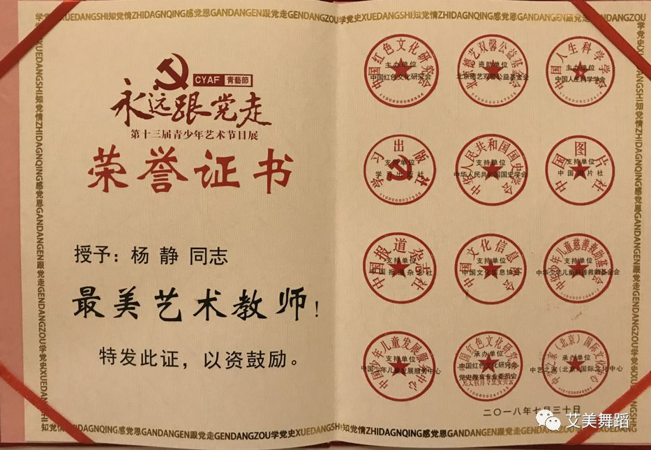 在昨天刚刚结束的“第十三届永远跟党走全国青少年艺术节目展”开幕式上,艾美舞蹈杨静校长被评为全国“最美艺术教师”。杨校长这些年为艺术教育和慈善事业所做的贡献,作为艾美人,大家有目共睹!